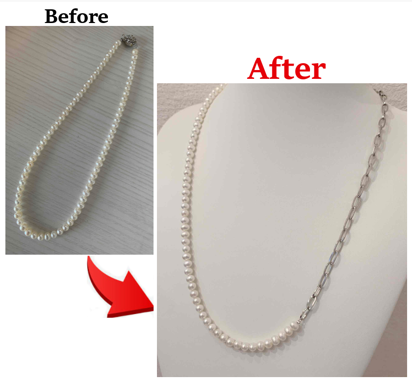 一連のパールネックレスに地金チェーンをプラスし、カジュアルに使えるジュエリーに。