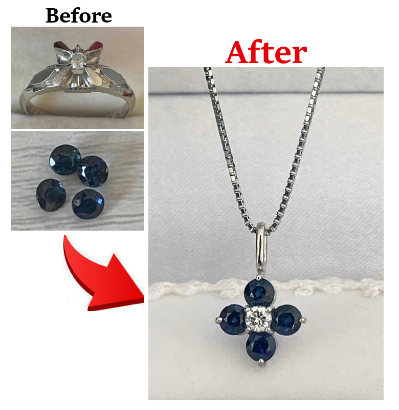 年代物のダイヤリングとサファイヤのルース。それぞれの宝石の魅力を活かし、花モチーフのペンダントをお仕立て