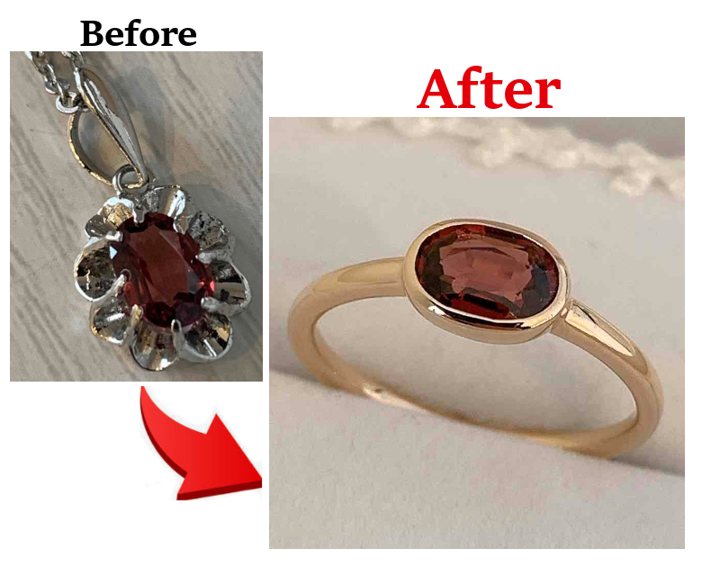 若い頃に贈られたガーネットのネックレスを、今のご自身に似合うK18リングへリフォーム。 思い出を大切にしながら、日常で楽しめるジュエリーへと生まれ変わりました。
