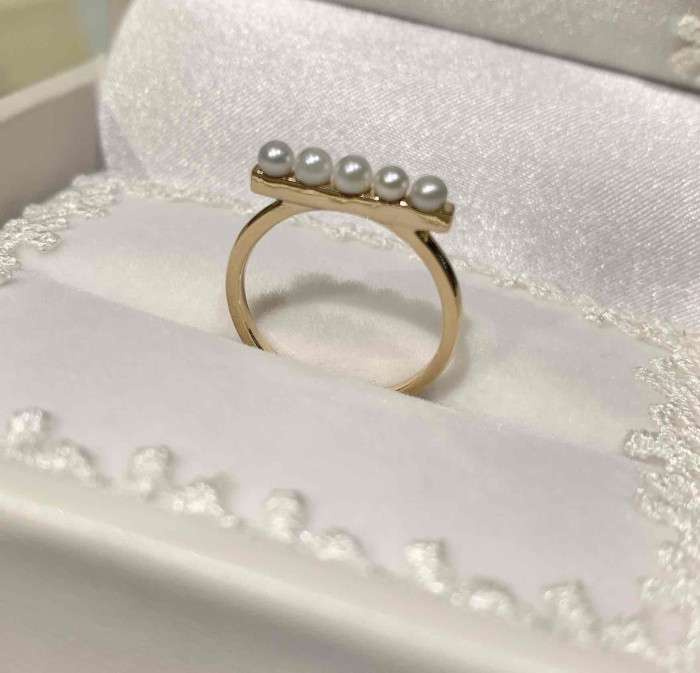 素材にはK18、アコヤ真珠の中でも希少なベビーパールを5粒を用意し、リングを製作いたしました。