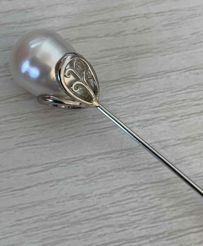 棒の先に一粒の真珠を配したピンブローチは、通常のブローチよりもすっきりとした印象で、スーツやコートの襟もとに限らず、カーディガンやストール留めとしても使いやすいデザインです。
