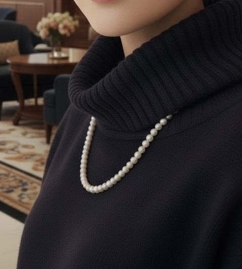 最短に調整すれば、正統派のチョーカーとして今まで通り冠婚葬祭のフォーマルシーンにお使いいただけます。