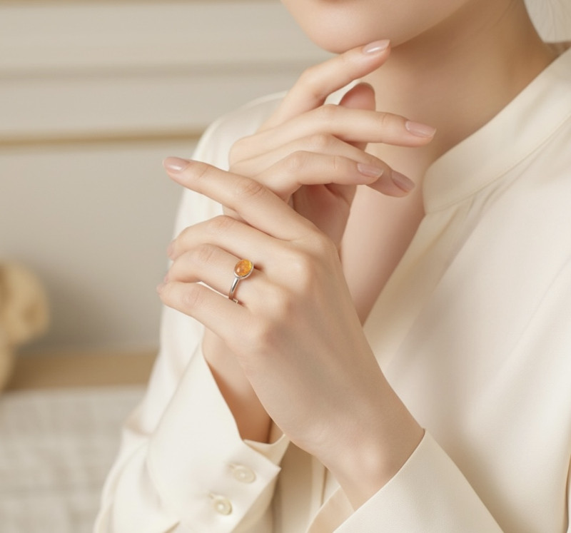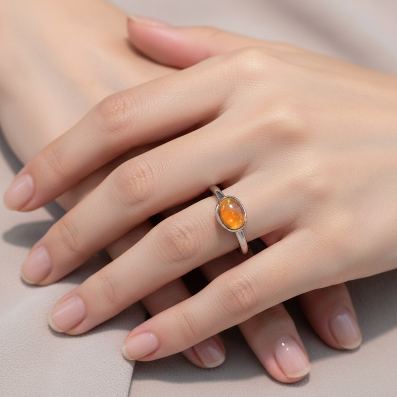 太陽の光を思わせるような鮮やかなオレンジの中に、遊色が現れる美しい宝石。