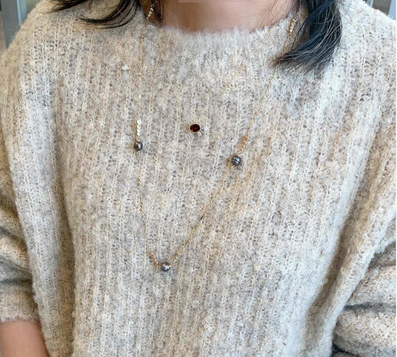 細身のチェーンとの重ねづけも楽しめ、ハイネックの余白を美しく埋めてくれます。