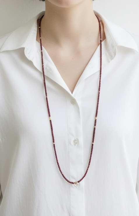 あらためて1連のロングネックレスへと組み直しました。