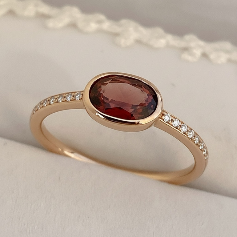 石を横向きにセッティングし、地金にはK18ピンクゴールドを使用。