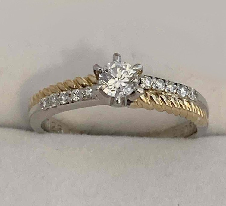 セリーヌのプラチナ&K18イエローゴールドの婚約指輪。