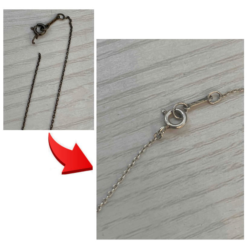 ロー付け加工によるチェーン修理と、シルバーの黒ずみを除去し、本来の輝きを取り戻しました。