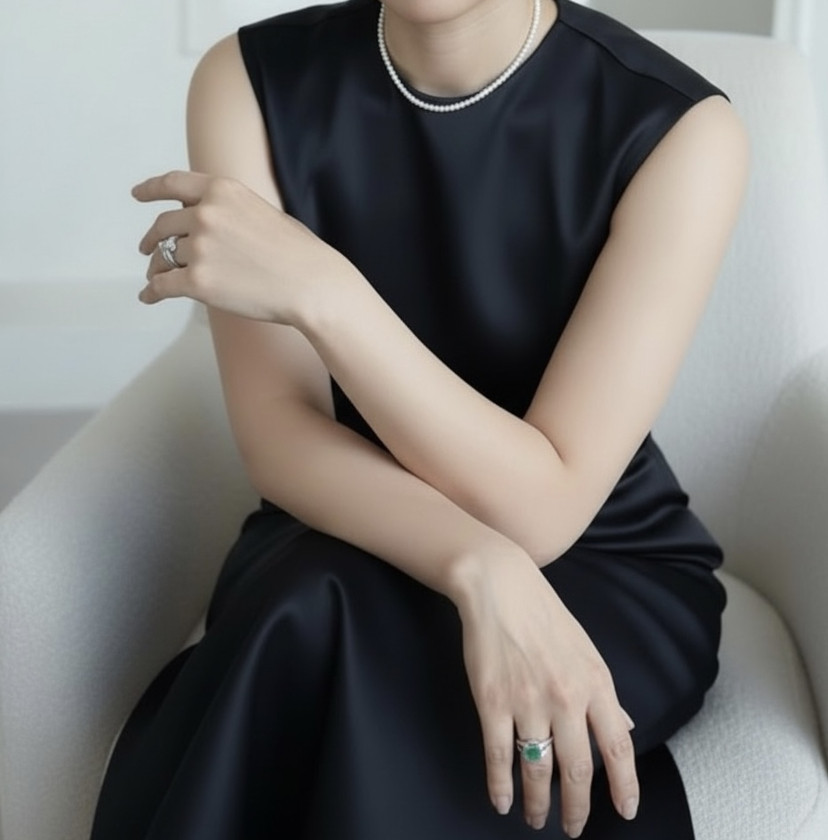 足し過ぎず、引き過ぎず。ジュエリーと装いが美しく響き合う、見事に調和のとれたコーディネート。